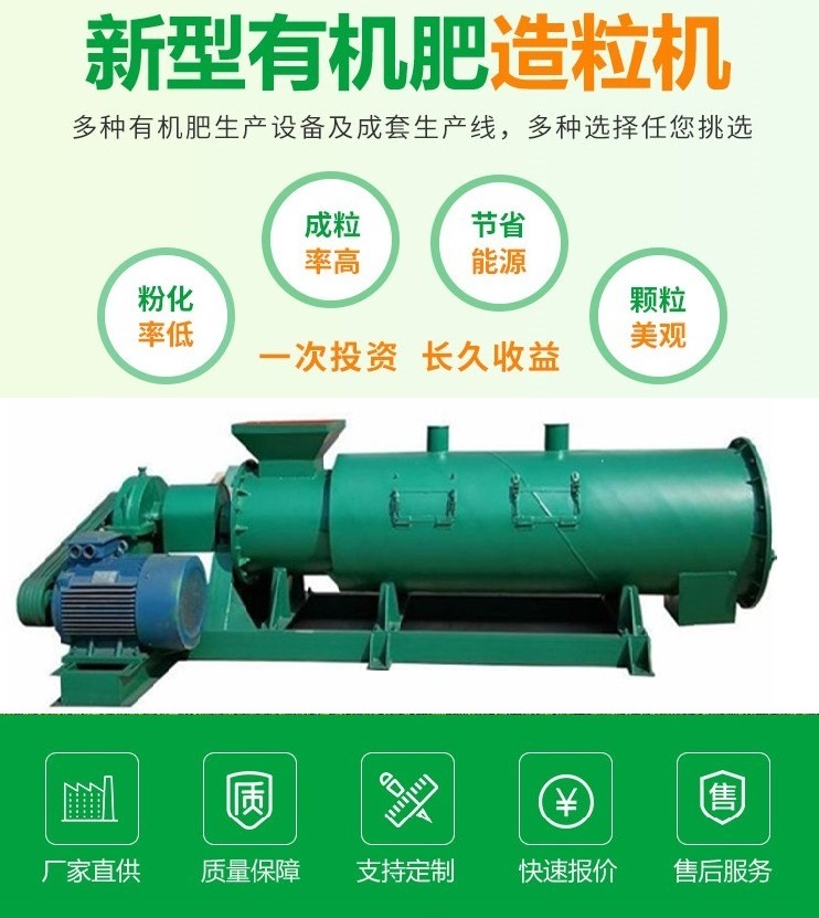 采用新型有機肥造粒機對物料進行制粒。本系統的作用是將粉碎配料混合完備后的物料制成顆粒。制粒適宜采用圓盤造粒機、攪齒造粒機、或者新型攪齒轉股三組合造粒機,其優點是:原料適應性廣,尤其適合有機物料,對原料密度、原料水分要求寬泛,造粒穩定,顆粒成型率高,成品顆粒外觀均勻不易破碎;
