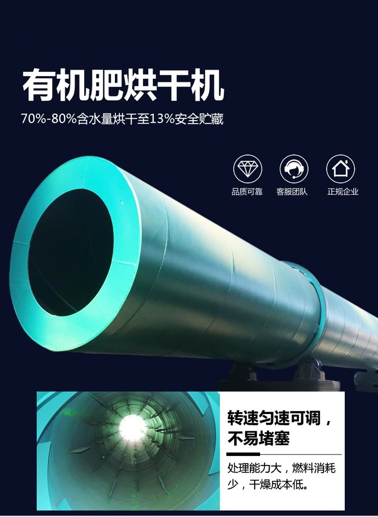 使用有機肥烘干機,將造粒好的顆粒,進一步去除水分,達到有機肥含水率的標準要求。