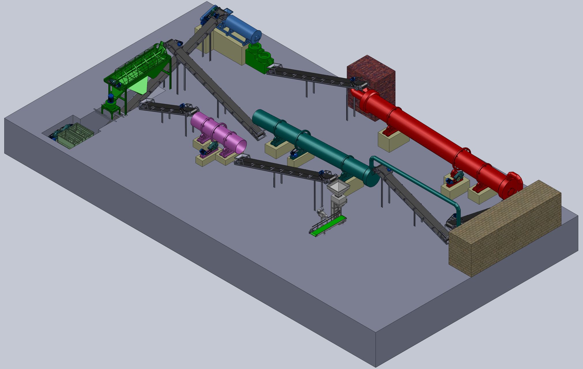 通過滾筒篩分機將不合格的顆粒分離出來,利用皮帶輸送機輸送至粉碎機,重新粉碎攪拌造粒,合格的顆粒則進行下一道工序。
